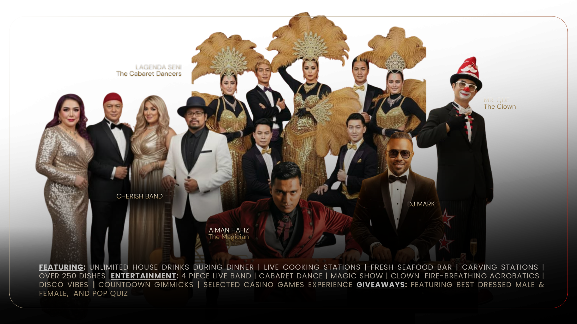The night is packed with exciting performances, including live music by The Cherish Band, cabaret dances, magic shows, fire-breathing acrobatics, and disco vibes for the countdown. Enjoy selected casino games, and don’t miss your chance to win prizes for Best Dressed Male & Female, Best Dressed Couple, and pop quiz winners.